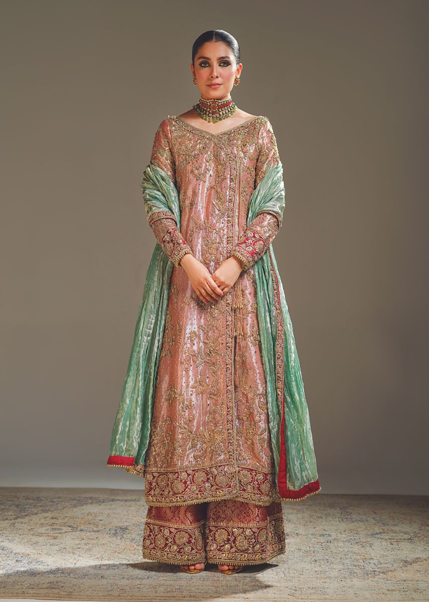 Coral, Peach and Gold Bridal Peshwas and Lehnga Set - BRIDAL