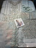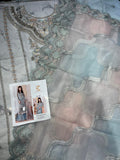 For those who love to wear pastel colours, along with a startle look, “Rimel” is the perfect design for you. This elegant dress features an organza base, delicately rendered floral motifs with jewel like neckline pattern on a hues of ferozi and pink. It is paired with double toned tranquil laser dupatta and crushed pants.