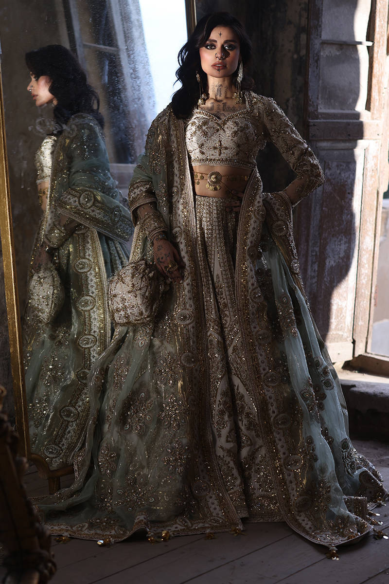 Illuminate the room with "Bibbojaan" in pearl white and gold from the Gold Series Hussan Ara Mansion Collection by Mohsin Naveed Ranjha. The choli, heavily embellished with opulent multihead embroidery on Italian silk, is a vision of timeless elegance, featuring net fabric sleeves adorned with embellished motifs and borders inspired by old Mughal architecture frescos. Paired with a Lehenga featuring intricate multihead embroidery and heavy adda work on an Italian silk base, it's a testament to luxurious craftsmanship. Delight in two divine dupattas: one crafted from organza with heavy embellishments and four-sided embroidered borders, and the other featuring a spray of sequins on diaphanous fabric with four-sided light embellished multihead embroidered borders. The accompanying pouch, adorned with sumptuous embroidery and silk Jamawar accent patches, exudes sophistication.