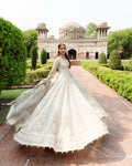 Indulge in ethereal elegance with the Cyra ensemble, a masterpiece of expert artistry and distinguished design. The voluminous chiffon pishwas, adorned with delicate sequins, resham, and tilla work, creates a breathtaking silhouette. Paired with a form-fitting viscose churidaar and an embroidered organza dupatta, this ensemble is the epitome of bridal luxury.