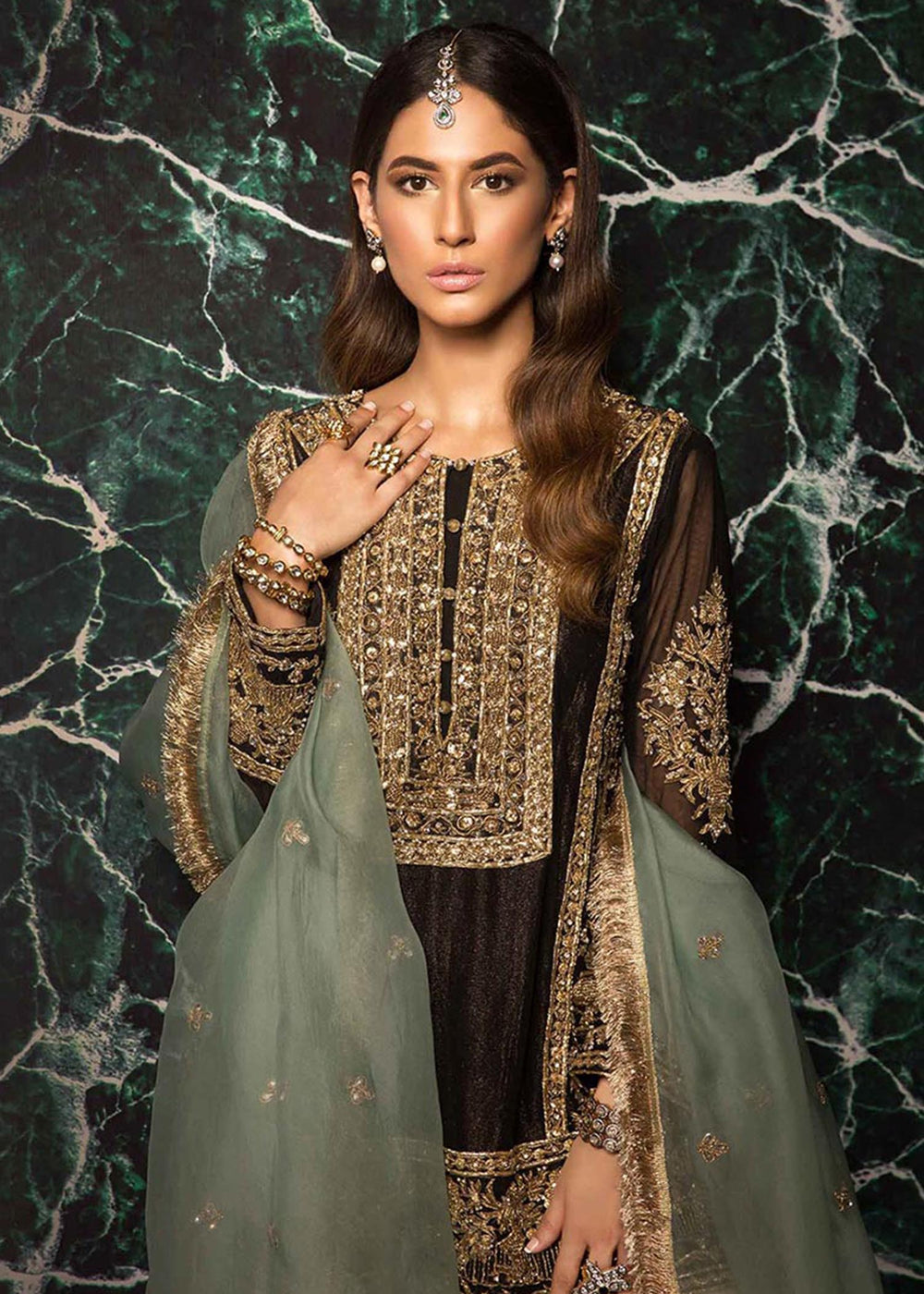 Indulge in the epitome of effortless elegance with the Gilded Onyx ensemble. Designed to empower the modern woman, this outfit combines fluid silhouettes with intricate handwork. The meticulous attention to detail, from the delicate embellishments to the luxurious fabrics, ensures a breathtaking look that is both timeless and contemporary.