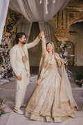 An offwhite organza pishwas and duppata paired with raw silk lehnga is heavily embellished with zarri, dabka, sequence and resham