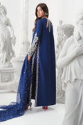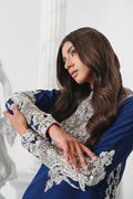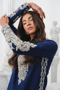 "An amalgamation of beauty and elegance 'Astral,' an obsidian, elaborately beaded pattern, includes subtle but elaborate embroidery in silver tones placed over a luscious, midnight blue canvas. Fine workmanship on the slits complements the shirt, producing the ultimate exuberance of luxury. The shirt is additionally embellished with elaborate embroidery depicting nature's starry night on the sleeves and neckline. This mesmerizing pattern combines refinement and a timelessly fascinating design sensibility when paired with an organza sequin embroidered organza dupatta.