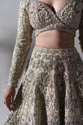 Meet Livia, a celestial vision in a neutral light hue presenting Soraya’s craftsmanship on tissue canvas. This bridal attire features an off-white attire adorned with delicate floral patterns in peaches, lilacs, and greens. Luxuriously woven with iridescent sequins and pearls, ‘Livia’ captivates with its regal charm.