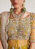 A spectacular lime yellow net peshawas with an embellished choker neck attached to intricately detailed front. The panels of peshwas are covered with beautiful chatta of small sequin bunches. The border of peshwas is made in a beautifully designed pattern which is also intricately detailed with adda work.