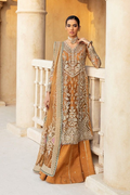 Rust never looked so ravishing! Introducing our breathtaking Naira festive formal dress, in the rich hue of rust, this gown is truly a delicate composition, with its attention to detail and exquisite craftsmanship paired with a gleaming sharara. From the moment you slip into this standout piece of Sarang bridals and Formals, you'll feel like the most beautiful and confident version of yourself. The gotta and dabka naqshi work on this dress adds a touch of sparkle, and the delicate pink and lilac threads used in the embroidery work add a feminine touch to the entire ensemble. Naira is the ideal choice for you to keep it trendy yet traditional.
