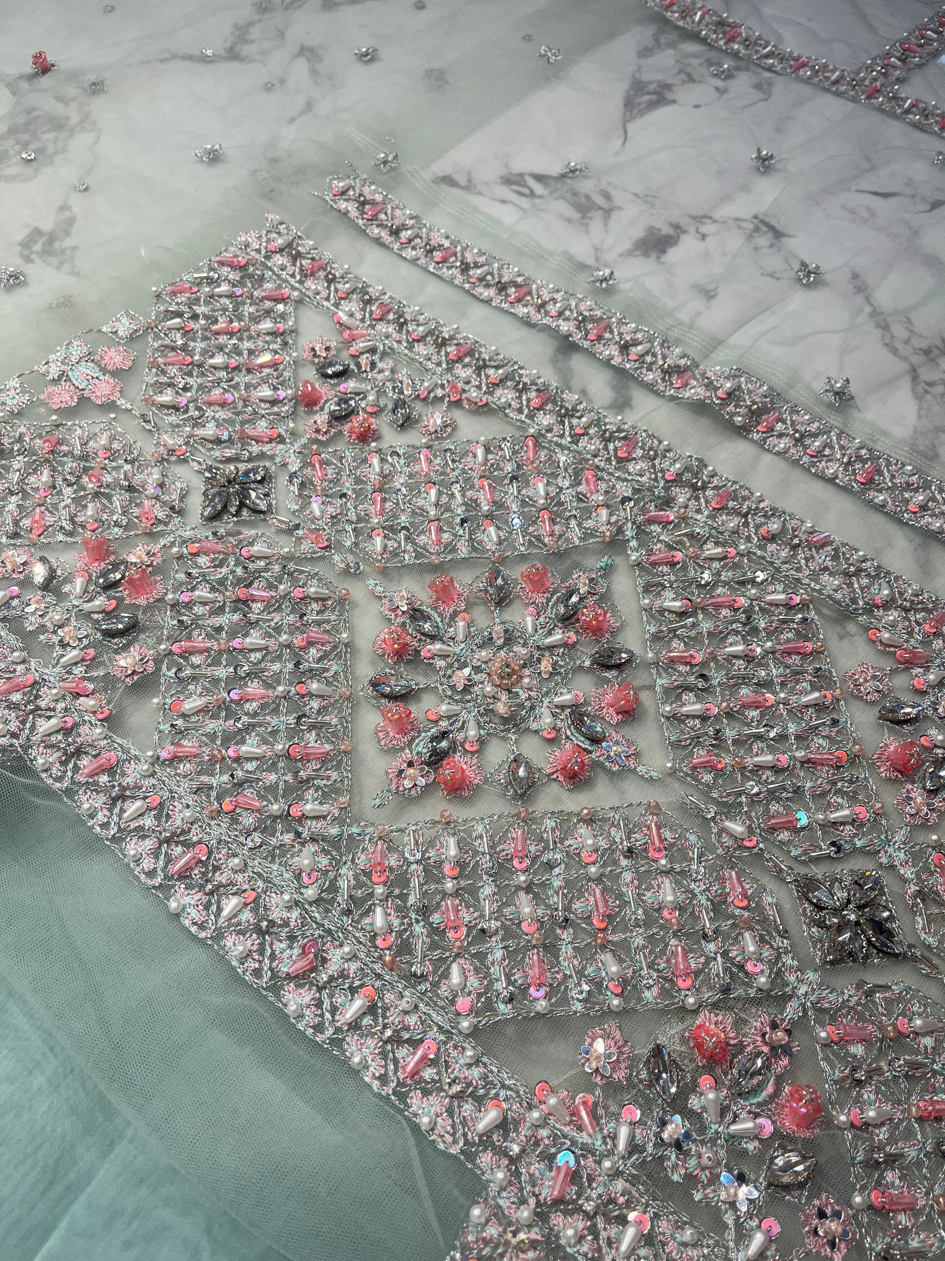 This ice blue net pishwas is gorgeously emberoided in hues of pinks and blues along with silver tilla. Adorned with pink and silver pipe work, mukesh, dabka, naqshi and stones.Completing the look with crushed silk sharara with heavy borders along with net dupatta featuring thick embellished four sided borders.