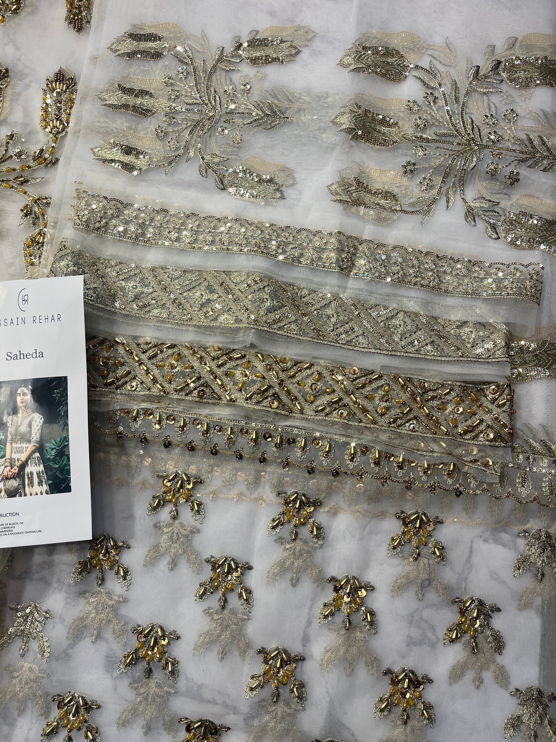 A classic Ivory organza peshwas crafted with exceptionally intricate embellishment of handwork on body, sleeves and in panels, pairing with rich satin silk lehnga with chanderi silk border finishing. To complete the grandeur look it comes with organza duppata with heavily embellished borders on four sides and with net duppata finishes with gotta and Kiran on four sides.